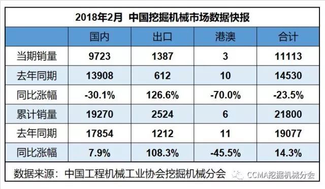 2018年1-2月共計銷量各類挖掘機械產品21800臺,同比漲幅14.3%。國內市場銷量(統計范疇不含港澳臺)19270臺,同比漲幅7.9%。