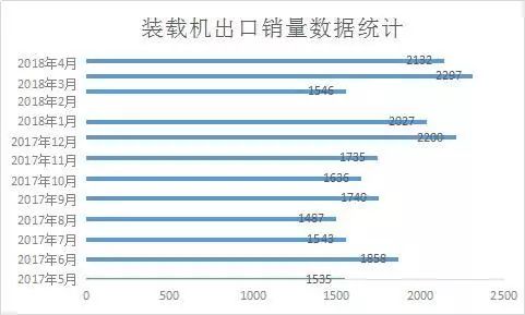在出口方面,2018年4月,裝載機(jī)出口2132臺(tái),占4月總銷量的15.8%。2018年前四月累計(jì)出口約8000臺(tái),同比增長37%;前四月累計(jì)銷量約44120臺(tái),同比增長38%;國內(nèi)外增幅趨勢(shì)保持一致。